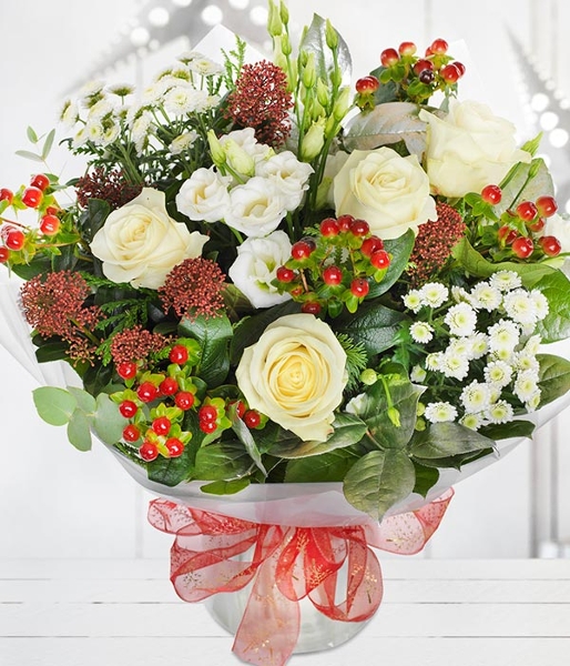 A Christmas arrangement that is sure to spread cheer. With crisp white roses, white chrysanthemums and hypericum berries combining beautifully to create this festive bouquet. A fantastically festive Christmas bouquet. Professionally arranged and hand-delivered by your local florist.